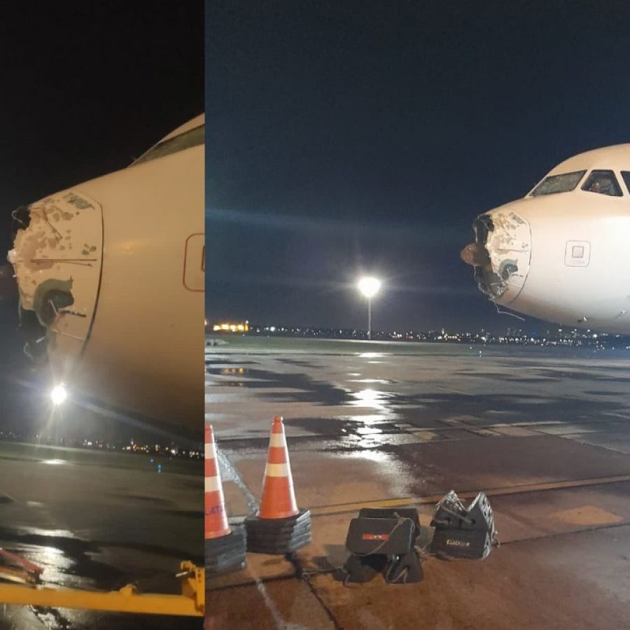 En el vuelo viajaban 48 personas e imágenes obtenidas por la estación muestran a la aeronave dañada, sin la nariz y con el parabrisas golpeado.