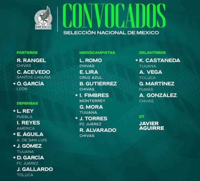 El listado, presentado por el cuerpo técnico encabezado por Javier Aguirre, fue dividido en dos grupos: