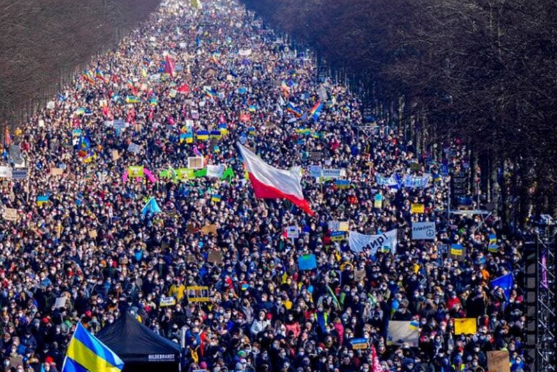 Con banderas de Ucrania, más de 100 mil personas se reunieron frente a la Puerta de Brandeburgo, el Reichstag y el edificio de la Cámara de Diputados para manifestarse y pedir alto al ataque ruso.