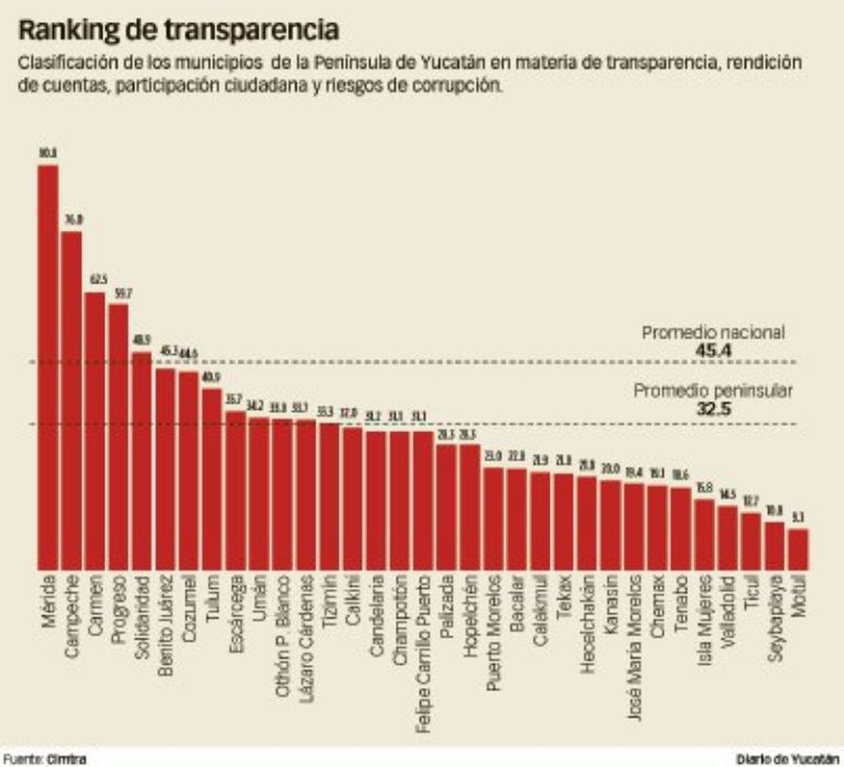 De 33 municipios que evaluó el colectivo nacional en la Península de Yucatán, solo tres —Mérida en primer lugar— obtuvieron una calificación aprobatoria, por tener información disponible y accesible al ciudadano. Los treinta restantes salieron reprobados.