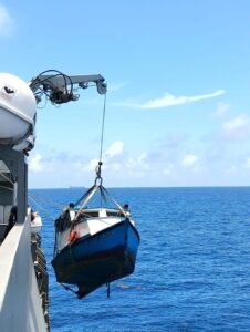 mar, se ordenó el zarpe de una Patrulla Oceánica con personal de Sanidad Naval y de Infantería de Marina como seguridad y apoyo, dirigiéndose al área señalada, efectuando el rescate de los tripulantes.